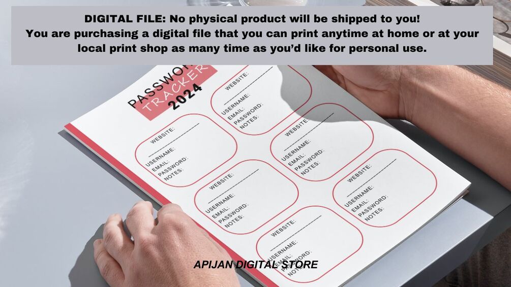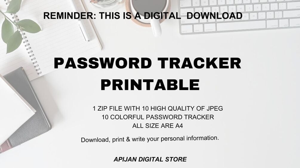 This Password Tracker Printable is a perfect tool to keep your login info for your apps, accounts and websites all in one place. Upon purchasing this Password Tracker Printable you will receive 1 Zip File with 10 high quality of JPEG (A4 size).